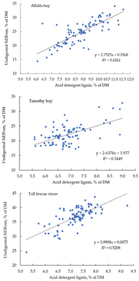 The following supporting information can be downloaded at: https://www.mdpi.com/article/10.3390/agriculture12111914/s1, Figure S1: Ratio of undigested NDF/acid detergent lignin (ADL) versus ADL/neutral detergent fiber (NDF) using a pool of alfalfa hay, timothy hay, and tall fescue straw (n = 264).