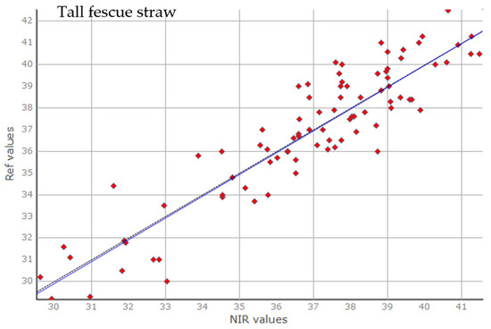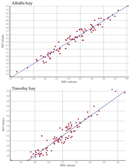 According to Karoui et al. [70], an R2CrV between 0.82 and 0.90 is interpreted to have an acceptable estimation of the reference value, while a value greater than 0.91 suggests an excellent estimation. This criterion implies that uNDF prediction in alfalfa hays using NIRS provided an excellent estimation but an approximate estimation for timothy hay and tall fescue straw. The poorer predictive results for timothy hay and tall fescue straw relative to alfalfa hay could possibly be related to the narrower range of uNDF values in timothy and tall fescue forages [71]. The RPD and RER values for timothy hay and tall fescue straw suggested that the models developed were moderately useful, with limited applicability for quantitative purposes [69,72,73].