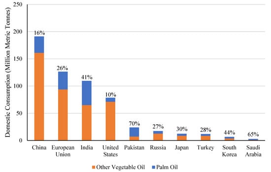 5] show that Indonesia exported 25.9 million tonnes (USD 17.3 billion) of palm oil in 2020, while Malaysia exported 14.6 million tonnes (USD 9.8 billion). Interestingly, the global domestic consumption of palm oil has also expanded drastically from just 10% of total vegetable oil consumption in the 1970s to more than 38% in 2019 [