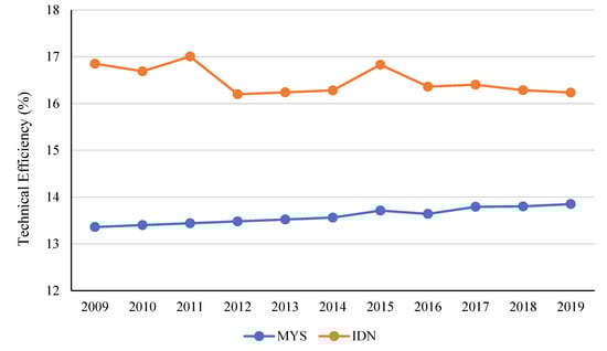 Figure 2, where on average, the value of TE for Indonesia is higher than in Malaysia throughout the year. However, it can be seen that TE for Malaysia has a growing trend. On the other hand, Indonesia has had a declining trend since 2015. This indicates that the existing measures and policies taken by policymakers in Malaysia positively impact palm oil exports. However, it is still not sufficient, as the TE gap between Malaysia and Indonesia is still huge. This highlights the need for policy interventions to ensure that exporters in Malaysia can compete in the international market and further increase their market shares.