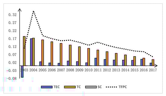 Based on the study of Liu et al. [], this paper calculates the concrete values of China’s agricultural TFP and its components by referring to the estimated results of the stochastic frontier model, in which the inefficiency term has a semi-normal distribution, from 2003 to 2017. We divide China’s agricultural total factor productivity into TEC, TC, and SC, and the results are shown in Figure 3.