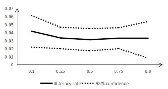 Quantile regression analysis describes how the independent variable affects the different quantiles of the dependent variable. At different quantile levels, the parameter coefficient represents the effect of the same influencing factor on the dependent variable [,]. This paper analyzes the effects of agricultural TFP and the education level of farmers on the rural–urban income gap under different quantiles, and the results are shown in Table 8. For simplicity, we report only the results estimated at the 10th, 25th, 50th, 75th, and 90th quantiles. The estimation results in Table 8 show that, at each quantile level, the increase of farmers’ education level significantly narrows the rural–urban income gap, but its coefficients are different at different quantiles. Figure 4 shows the coefficient of the farmer illiteracy rate and its 95% confidence interval at different quantiles. At the 75th quantile level, the illiteracy rate of farmers has the greatest impact on the rural–urban income gap. When the illiteracy rate of farmers is reduced by one percentage point, the rural–urban income gap is reduced by 0.0329.