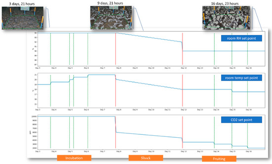 Example of parameters (relative humidity (RH), temperature, and CO2) managed during the cultivation process. Red vertical lines represent termination moments of Incubation and Shock stages. Dashed green lines represent technologists’ actions to change the values of parameters. The photos provided on top visually represent the process on the 4th, 10th, 17th day of the process. The labels in the horizontal axis represent the number of days passed from the start of the cultivation.