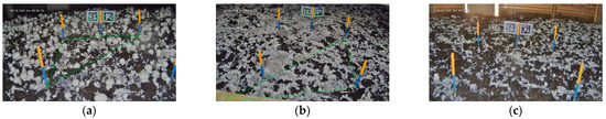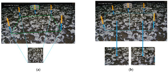 The progress of the mycelium spread, and mushroom growth speed depends on the microclimate, which is created because of location in the mushroom growing hall and level of the shelf. For example, the distance to ventilation sources, the gap between the ground, and the lowest shelf compared to the gap between the two lowest shelves can cause a difference in the actual values of the climate parameters and, therefore, impact the growth progress. Thus, it is not enough to make climate change decisions based on the visual information extracted in one location. Using multiple stationary cameras limits the number of observed locations by the number of camera devices, requires ensuring an internet connection, and requires additional steps in preparing data for the decision-making model. Thus, it was decided to construct a system that enables the movement of one camera device vertically (between the shelves) and horizontally (along the shelf) and the observation of a predefined number of locations (Figure 3a). The images are taken at 4 positions on one shelf. The top shelf is not monitored due to a different microclimate emerging because of the significantly longer distance from the shelf to the ceiling of the growing hall. To sum up, 12 images are generated during one cycle which is repeated every 4 h during cultivation process. The light needed for mushrooms to grow is too dim to get images of a good enough quality for the analysis. Thus, the bright light was used while images were taken. Due to the vibrations during camera motion, the camera stops at a slightly different position and takes a photo of a slightly different area in every cycle of taking photos. It is important to monitor the dynamics of the mycelium growth, so the markers from the dictionary of CHARUCO library are applied to define the position identifier. Another dictionary from the same library is used to define the identifier of the mushroom growing hall. The monitored area is detected during the analysis of every image based on the positions of the yellow part of the yellow-blue sticks. Only the upper part of the sticks is used for calibration because the lower blue part is partly covered with mushrooms in late growth stages. The sticks are in the corners of a square, and each part of the stick (blue or yellow) is 5 cm long. The distance between the sticks can be defined dynamically; 30 cm was used in the examples. The known distance between the markers is also applied to estimate the size of the mushroom caps. The results of the calibration for the images taken on the 6th, 10th, and 15th days of the cultivation process for the same position are shown in Figure 3b–d.