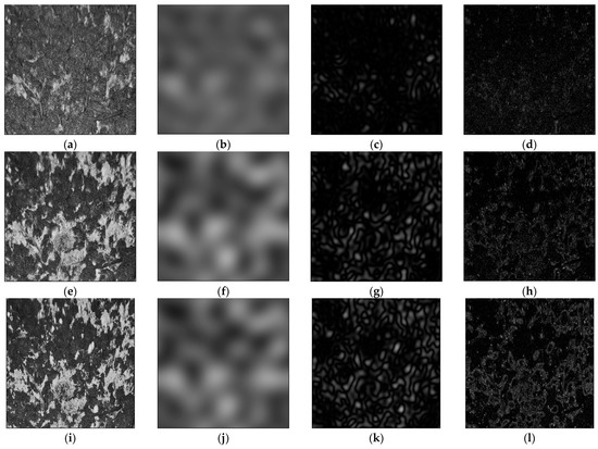 Grayscale images (a,e,i) and Fourier analysis results, that is, respective images of reconstructed based on low frequency (b,f,j), medium frequency (c,g,k) and high frequency filter (d,h,l) on the 5th, 9th, and 13th days of the mushroom production cycle.