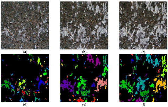 During the early stages of mushroom production, it is important to evaluate the dynamic of the mycelium growth, especially in the early stages of cultivation (before the pinning). The number of components represents the number of separate areas where the mycelium appears on the surface of the compost. A morphological analysis is used to process pixels in their neighborhood to find the connected components of a significant size. A threshold value is selected to filter out noise components. The examples of the morphological analysis results are provided in Figure 7d–f) for the respective grayscale images in Figure 7a–c). There is a 48-h time gap between the moments two adjacent images were taken. In the earliest image (Figure 7d), the number of components is high, and the average size is small compared to the later examples. As the time passes, separate components connect in between and form the components of large areas (Figure 7e,f).