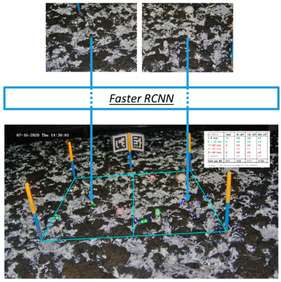In later stages of mushroom production, it is important to monitor the dynamics of the mushroom growth. Faster R-CNN is employed to detect the mushrooms. The architecture of the Faster R-CNN combines a convolutional neural network, regional proposal network, and fully connected neural network (20). After preparing two images to represent different sides of the monitored area, Faster R-CNN is applied to detect bounding boxes of the mushrooms (Figure 8). The results are aggregated to show the detected objects in the initial image. The diameter of each object is estimated proportionally to the known distance between the markers of the monitored area. Object detection results used as features in AI-based system are as follows: