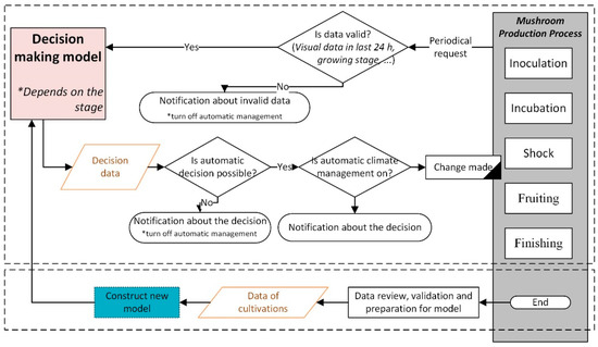 The mushroom production process is based on a well-established procedure with climate parameters selected from a specific range. A popular approach is to manage climate automatically to adjust the parameters predefined by the technologist while during the growing process, technologist performs climate correction to the process deviations. However, this approach highly depends on the knowledge and experience of the single technologist because there are no strict rules which describe optimal climate management for each situation. In addition, manual monitoring of the growing process to take necessary actions on time is a time-consuming process and has a high-risk level for human error, especially if there are many halls at different growing stages under the technologist’s care. In the presented approach, a new layer with an AI-based component is included, which enables knowledge sharing and improves the decision-making process.