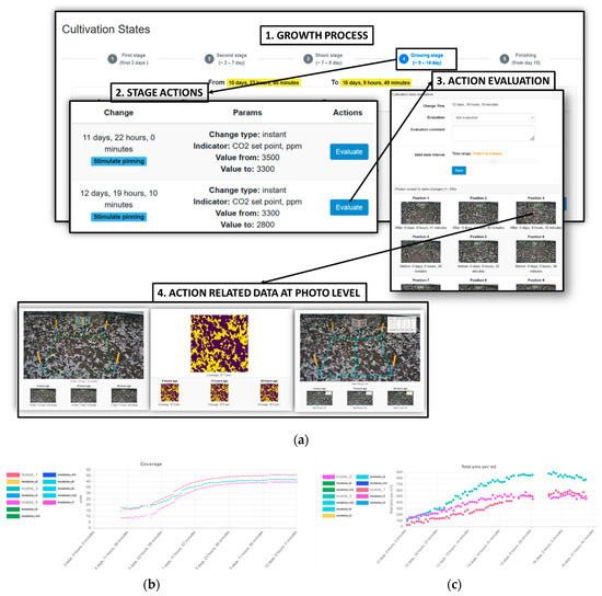 During the data collection stage, the growing process from the technologist perspective continues as usual while a created layer collects visual data, climate data, and information about the actions performed by the technologist during the growing process. After the growing process, the technologist reviews the growing process and evaluates the applied decisions based on the historical data using a created WEB-based interface. Several user interface screens are provided in Figure 10 to demonstrate how the technologist can follow the growth process and perform action evaluation by analyzing the full growth process information. Here, the technologist can access all the information before deciding about action assessment for the selected cultivation for each stage (Figure 10a, part 1), see all changes (Figure 10a, part 2), and (Figure 10a, part 3) provide an assessment of the change in the evaluation form. To help the technologist make a decision, photos at the different positions closest to the time of the change are provided in the evaluation form. They can also access a detailed analysis of each photo (Figure 10a, part 4) or check the dynamics of the climate or visual parameter during the growth process as a time series graph. An example of the dynamics of mycelium coverage percent in a range of 3–12 days is shown in Figure 10b. The change of the total number of pins normalized per m2 for 12–16 days is provided in Figure 10c. It also demonstrates the disturbance in data collection on the 15th day as there were no photos collected. Aside from the screens provided in Figure 10, the technologist can use the interface to access other information related to the growth process, such as administrative data about the substrate; watering process information; graphs of the visual indicators’ changes; and the setting and monitoring of values of different climate indicators such as compost/room temperatures, CO2, and other. The values of the observed parameters were collected in 10-min intervals without the disturbance for all cultivations. It makes the review of the actions more convenient for the technologist and lets them evaluate the action to change the climate as accurately as possible.