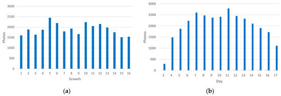 Finally, in order to create the initial decision-making model, data of 16 historic cultivations were reviewed by the technologist and used as the training dataset. The production process was carried out in two cultivation halls in the north of Lithuania. The amounts of collected valid photos based on the cultivation number and growing day are provided in Figure 11. All selected cultivations had more than 1500 photos each to ensure the diversity of locations during the training process. The number of images taken per growth period (Figure 11a) can vary due to the different time the stages lasted in different cultivations, the interference of the image-taking process because of technical issues, and other reasons. The variance of stage duration results in a small number of images to represent the 3rd, 4th, and 17th days of cultivation (Figure 11b), but there are more than 1500 photos to represent the 5th–16th days (that is, for the period where changes are suggested).