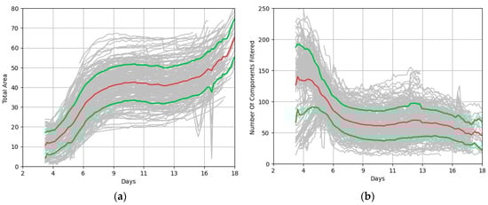 Results of morphological analysis: total number of components (a), mean area of components in pixels (b). The brown line represents the medium value, the green line represents standard deviation.