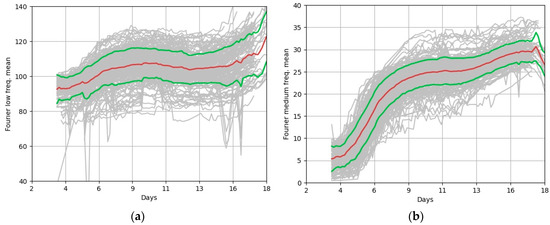 Results of Fourier analysis for low pass mean (a) and, medium pass mean (b) filter intensity. The brown line represents the medium value, the green line represents standard deviation.