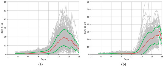 The results of the Fourier analysis are provided in Figure 14 for each monitored area. The presented figures show that the number of objects with a diameter of 5–10 mm changes steadily), reaches its highest value on days 14–15, and begins to decrease. During that period, the number of objects with a diameter of 11–20 mm starts to increase.