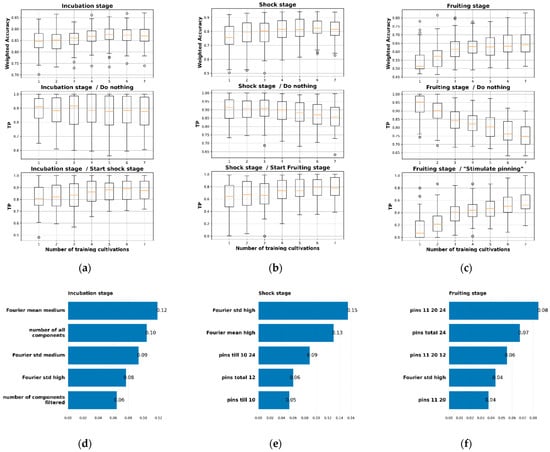 Boxplots of experimental distribution of weighted accuracy and true positive (TP) rates for each class of the decision-making models in incubation stage (a), shock stage (b), and fruiting stage (c), and averaged importance of variables in training with 11 cultivations for incubation (d), shock (e), and fruiting (f) stages.