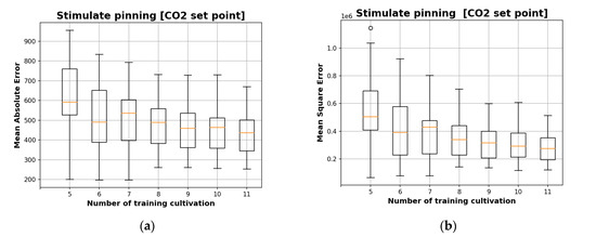 The same bootstrapping sampling methodology was used to separate data instances by cultivation and, therefore, to construct training datasets for the analysis of the performance of the KNN method as the number of training samples increases. The results were demonstrated for the changes of CO2 because of the largest number of distinct values of change (see Table 4, there are 7 distinct values for the changes for CO2, 3 for the RH set point, and 4 for the room temperature set point). The boxplots of experimental mean square and absolute errors of CO2 set point values with a different number of cultivations used for training are provided in Figure 16. The results show that the performance of the model improves as the larger number of cultivations are used for the training.