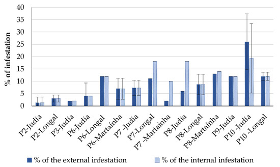 Percentage of external and internal infestation at different processing stages for the varieties Longal, Judia and Martaínha (mean ± SD; n = 50). P2, P3—sterilized chestnuts (0 and 15 days storage); P6—unsterilized chestnuts in reception; P7, P8, P9—unsterilized chestnuts after storage (15, 30 and 45 days, respectively); P10—sterilized chestnuts rejected by sorting.
