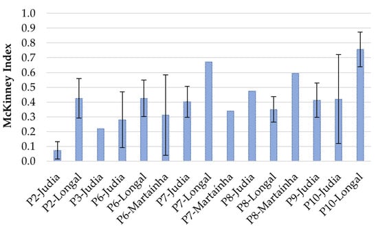 Shannon–Wiener diversity (H’) revealed a similar pattern of total species (Figure 5b), with the highest values being reached in P6 to P10, and the lowest values in P2 and P3 samples. The evenness index (J’) ranged between 0.609 and 0.964 in Judia (P2) and Longal (P2), respectively, being virtually constant in the Longal and Martaínha samples. Contrary to this, in Judia samples, J’ underwent greater variations.