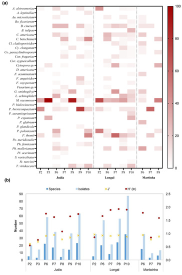 (a) Heat map of the frequency of the fungal species (in percentage of analyzed chestnuts), obtained for each storage and processing stages of the Judia, Longal and Martaínha varieties; (b) their respective total number of isolates and species, and diversity indexes (Shannon–Wiener, H’, and Pielou, J’).