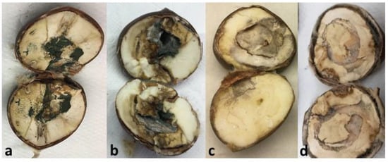 B. cinerea, generally associated with fruit decay and considered the causal agent of gray rot in chestnuts [11,12] (Figure 6b), was also frequently isolated. C. batschiana, showing the same frequency of detection as B. cinerea, has been identified as the causal agent of chestnut black rot (Figure 6c) and is responsible for causing severe post-harvest losses by disease [12,17]. It has been reported in Greece [44], Italy [9,17] and the USA [12]. C. batschiana and B. cinerea, with an average frequency of 10.6%, were detected in all the stages except in the sterilized samples. Nevertheless, C. batschiana achieved the highest frequency in rejected chestnuts (21.4%, in P10, Judia), which can mean that a significant level of black rotten chestnuts is eliminated by sorting.
