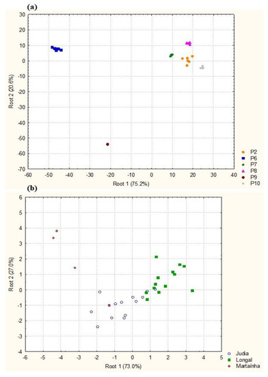 Diagrams for the first two roots obtained by MDA of mold species composition in processing stages (a) and chestnut varieties (b). P2—sterilized chestnuts; P6—unsterilized chestnuts in reception; P7, P8, P9—unsterilized chestnuts after storage (15, 30 and 45 days, respectively); P10—sterilized chestnuts rejected by sorting.