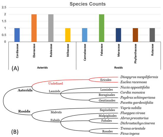 In the case of the Rosids, two clades were identified; the Malvids contained the order Sapindales and were represented by the Vepris nobilis (family Rutaceae) and the Fabids. The latter was presented by three orders, order Malpighales of single species Flueggea virosa (family Phyllanthaceae), order Rosales was represented by two species, Ficus ingens (family Moraceae) and Trema orientalis (family Cannabaceae), and order Fabales was represented by two species of the family Fabaceae, namely Abrus precatorius and Dichrostachys cinerea (Figure 2).