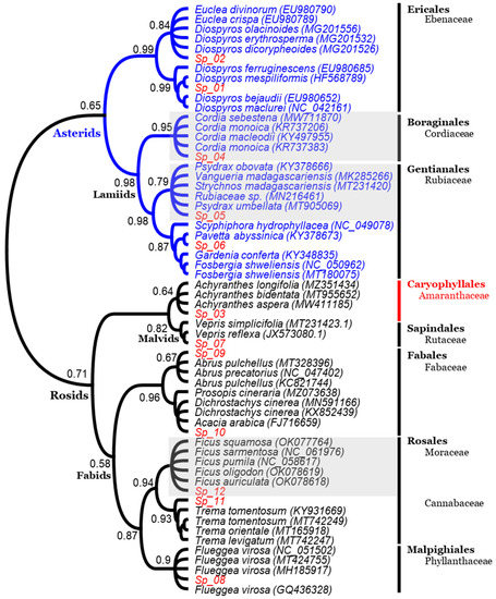 Species (01) and (02) were correctly clustered with other members of the family Ebenaceae, being closely related to each other and representing the order Ericales. Equally, the correct taxonomical assignment at the family level of the studied species was observed for species (04), (05), and (06), presenting the rest of the Asterids but separately clustered from the order Ericales. Species (07) and (12) were correctly assigned to their family members, but at a monophyletic position to all other families. An equal incidence was found for species (09) and (10) of the family Fabaceae. The case was different for species (08) and (11) where both were clustered within their families as Phyllanthaceae (order Malpighiales) and Cannabaceae (order Rosales), respectively clades but closely related to each other and against what would otherwise be expected. Species (12) was clustered with members of the family Moraceae of order Rosales, found on the head of the monophyletic clade.