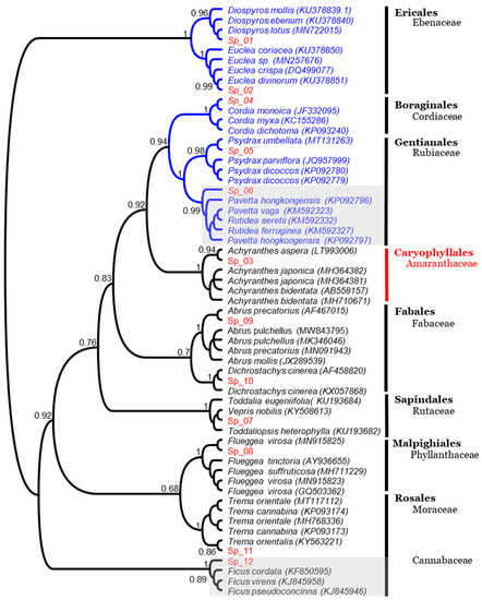 The studied species were all close to or clustered with the matched species at high bootstrap support (>0.86). However, the cladistic resolution was insufficient to determine the correct species identification for species (06) and (12), even though the BLAST results confirmed one of them as the top match. Moreover, species (03) was differently identified from what would be expected and was positioned as a member of the Amaranthaceae family (order Caryophyllales, Rosids; Figure 4).