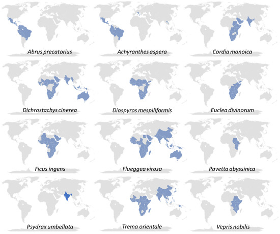 The applied DNA barcoding method was used to identify this group of species to gather data in order to understand its geographical distribution, endemism, and rarity in Saudi Arabia, as well as worldwide. According to the IUCN Red List of Threatened Species in 2021, all the identified species were labeled as “Least Concern” worldwide. However, regarding their distribution in the Faifa mountains, Jazan Province, Saudi Arabia, none of the identified species were recorded, except for C. monoica, D. cinerea, F. virosa, and the uncertain F. ingens. A. precatorius and A. aspera were not reported from the Arabian Peninsula, nor from proximate continents, along with P. umbellate, which was reported only from India. T. orientalis was reported as being widely distributed in sub-Saharan Africa and southern Asia. The two species, P. abyssinica and V. nobilis, were exclusively reported from the middle eastern part of Africa, along with E. divinorum, which extends to Yemen, a neighboring country to the sampling location (Figure 5).