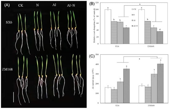An obvious inhibition of N and Al on root elongation was observed in both genotypes compared with CK (Figure 1A,B). For the relative root elongation, no significant difference was found between N and Al treatments in SX6, while significant differences were found in ZM168. Moreover, the relative root elongations of SX6 were markedly higher than those of ZM168 in the presence of Al (Figure 1A,B). A significantly higher Al content in the cell wall of root tips (0–10 mm) was found in both genotypes exposed to Al (Figure 1C). Furthermore, the Al content under Al+N treatment was much higher than that under Al treatment, while no difference of Al content was found under CK and N treatment. The Al content of ZM168 was significantly higher than that of SX6 when Al existed.