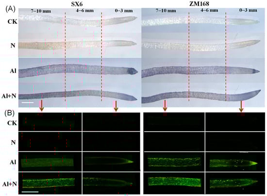 The Al localization ((A), hematoxylin staining and (B), morin staining) of root tips of two wheat genotypes (SX6 and ZM168) under CK, N, Al, and Al+N treatments. Scale bar, 1 mm.