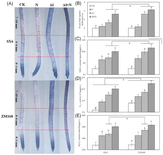 The Evans blue staining observation showed that the darkest color was exhibited in Al+N treatment, followed by the Al treatment, then the N treatment, and the last being the control, which was confirmed by the relative value of Evans blue uptake (Figure 3A,B). Moreover, the picture showed that the cell wall of root 7–10 mm zones were the most seriously damaged in both genotypes under Al+N treatment (Figure 3A). The MDA content, H2O2 content, and O2− activity in the root tips of SX6 and ZM168 showed the same pattern as the relative value of Evans blue uptake, except for the MDA and H2O2 content in SX16 under Al and N treatments (Figure 3C–E).