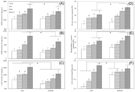 To alleviate the oxidative damage caused by ROS accumulation, plants have evolved a complex defensive antioxidant system that includes a combination of enzymatic and non-enzymatic components. Reactive oxygen enzymatic scavenging systems mainly include SOD, POD, and CAT, etc., and the activities of these enzymes respond to the strength of plant resistance in different degrees [,,]. In plants, AsA is an important reductant and exerts a powerful influence on plant functions []. In the present study, the activities of SOD, POD, CAT, and AsA were significantly increased under N or Al treatments, except for CAT content in the Al-sensitive genotype ZM168 under N treatment. The highest values of antioxidant enzyme activities in both genotypes were found under Al+N treatment, and the values in ZM168 were significantly lower than those in SX6 (Figure 4A–C). Thus, roots of both genotypes suffered heavy oxidative damage to the membranes and lipids as a result of the higher level of ROS under Al+N treatment than that under single N or Al treatment, especially for the sensitive genotype ZM168.