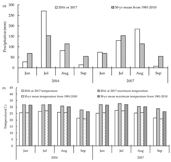 Mean monthly precipitations and temperature at the experiment site in 2016 and 2017 compared with the mean 30-year records (1981–2010) during the summer maize growing seasons, (a) Precipitation and (b) Temperature.