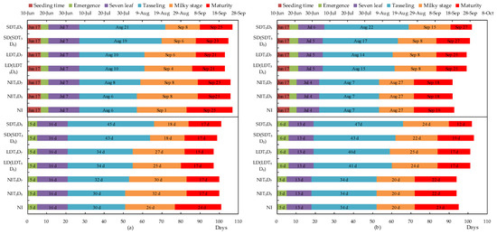 The phenophase of summer maize significantly differed between the treatments due to the interaction of high temperature and drought. Drought stress either delayed or advanced the phenological period of summer maize (Figure 4). Compared with NI, the mean delay of the vegetative stages was 5.5 days for LD, while it was 11 days for SD. However, the reproductive stages of maize were shortened due to the influence of drought. Compared with NI, the mean advance of the reproductive stages was 8 days for LD, while it was 15 days for SD in 2016. The mean advance of the reproductive stages was 2 days for LD and SD in 2017.