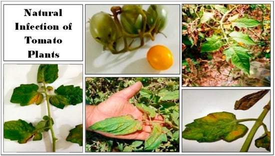 Cherry tomato plant samples cv. “Golden Cherry Hybrid” showing typical symptoms of Fusarium wilt disease were collected from a private farm in Borg El-Arab, Alexandria governorate, Egypt during the 2020 season as shown in Figure 1.