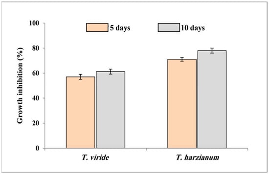 Bar graph represents the percentage of growth inhibition of the pathogenic mycelia of F. solani by Trichoderma spp. (T. viride and T. harzianum) 5 and 10 days post-inoculation, through dual culture assay. Error bars represent standard deviation of the mean.