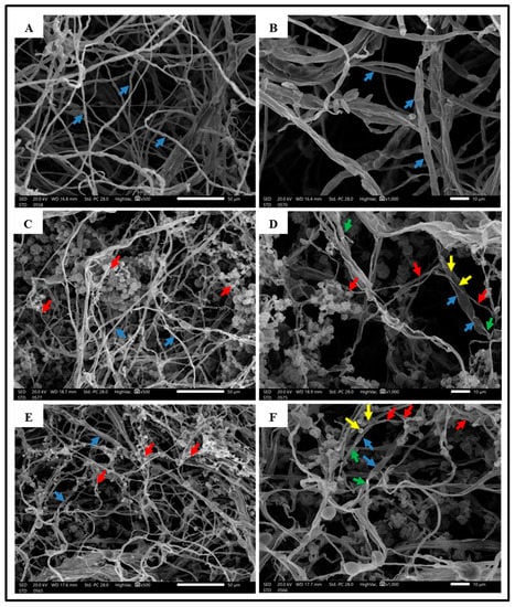 Scanning electron microscopy (SEM) images at different magnifications (500× and 1000×) show T. viride and T. harzianum mycoparasitism towards the pathogen F. solani (inoculated simultaneously). Figure 4A,B show higher growth of F. solani mycelium inoculated alone as control at different magnifications, and their mycelium growth is unchallenged by the biocontrol agents. Figure 4C–F shows overgrowth and heavy sporulation by both Trichoderma isolates on the colony of F. solani 10 days after inoculation at 27 ± 2 °C using dual culture assays on PDA. The mycoparasitic behavior of T. viride and T. harzianum was observed in the form of adhesion, coiling, penetration, degradation, and deformation of the F. solani mycelium, as shown in Figure 4. In addition to the parallel growth of these antagonist isolates that were closely linked to the pathogen, these two Trichoderma isolates were able to overgrow and sporulate on the colony of the F. solani pathogen. Based on SEM observations, the antagonism mechanisms of Trichoderma isolates towards the F. solani pathogen are competition for nutrients and space, mycoparasitism, and antibiosis.