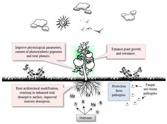 Graphical diagram representing the beneficial roles of Trichoderma spp. in cherry tomato nutrition and growth.