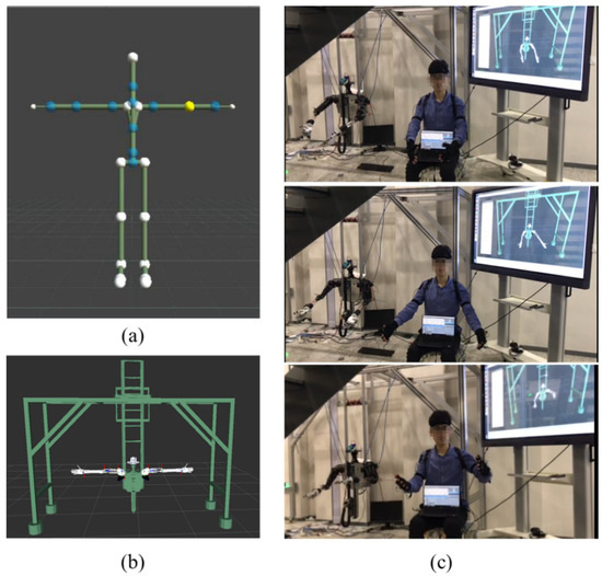 A Unified Robot Description Format (URDF) file is constructed in the robot operating system (ROS) that runs on the robot’s industrial computer. It contains the joint relations of each mechanical parts of the robot and real-time simulation of the robot can be realized based on the URDF file, as shown in Figure 4b. ROS transmits the mapped joint angle data in real time through the serial port to the lower machine with a 10 Hz sampling frequency. Then, the lower machine drives the joint servos moving to the corresponding angle. Therefore, the operator’s motion is mapped to the robot ontology. Some motion interactive experiments are shown as Figure 4c.