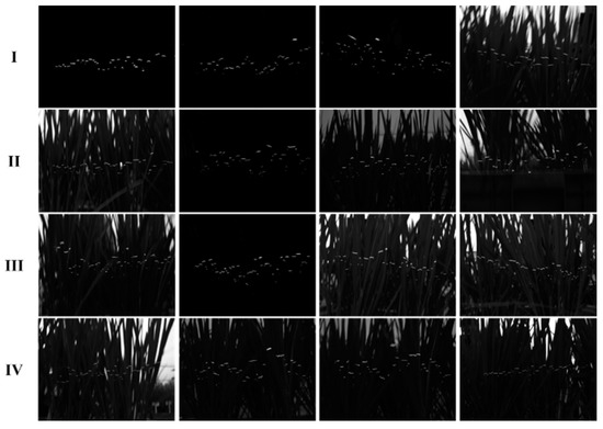 Following the image acquisition procedure illustrated in Section 4.1, a set of images are obtained in fields using the structured light system. Then, these images are categorized into four classes according to the rice plant tiller number. In large-scale variant breeding, we found that the total tiller numbers of most variants are mainly between 21 and 25 [37]. We hoped to achieve relatively accurate tiller counting in this range. Therefore, we subdivide this range and the numbers fewer than 21 and more than 25 are divided roughly. Some image examples are shown as Figure 6. The details of these images are shown in Table 1. These images are transformed to grayscale images and resized to 256 × 256. Then, they are randomly split into a training set and a testing set with the ratio of 3:1.
