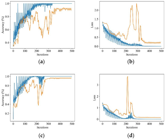 Training and testing accuracy and loss value curve. (a) CNN accuracy. (b) CNN loss. (c) AtResNet accuracy. (d) AtResNet loss. Blue line denotes training process and orange line denotes testing process.
