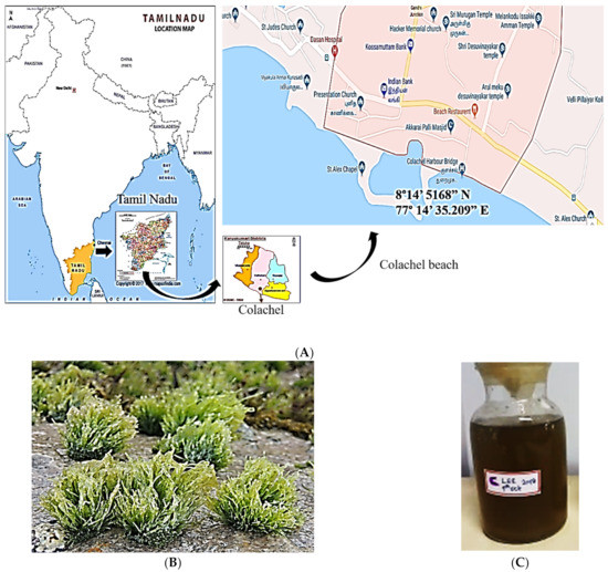 Sample collection site, seaweed C. antennina. (A) Sample collection site (B) C. antennina attached to rocks (C) liquid SWE.
