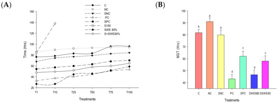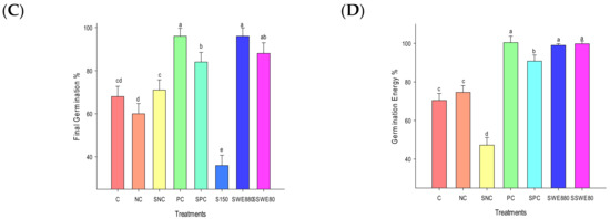 Effect of SWEs and salt on germination of rice seeds; (A) germination time course; (B) MGT; (C) final GP; (D) GE. Columns denoted by a different letter are significantly different at p ≤ 0.05 in Tukey’s test. Seeds exposed to salt treatment (S150 mM) did not reach 50% of germination.
