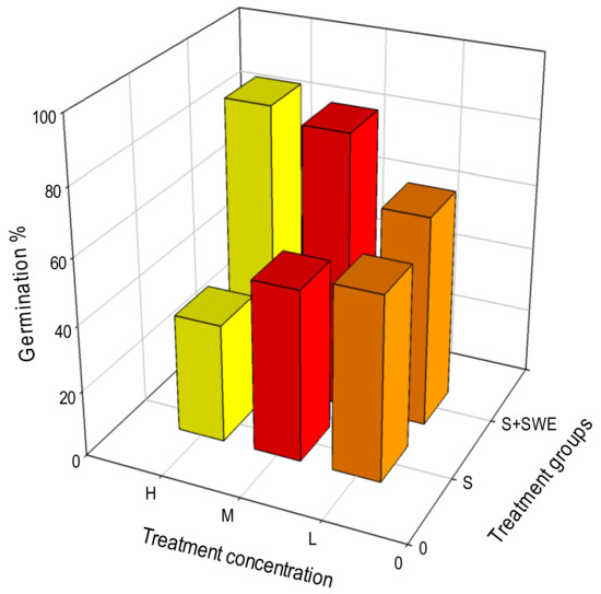 Seed priming effects of SWEs were instituted to ensure a favourable impact on early emergence and plant growth. SWEs not only spurred early seed emergence but also raised seed GP, whereas increasing salt treatments delayed seed emergence and lowered GP. The toxic effects of Na+ and Cl in the germination process might be to blame for the decrease in germination [39]. Salt stress appears to influence seed germination by limiting seed water absorption, causing protein synthesis abnormalities, and causing excessive nutrient pool usage [40]. Regardless of the circumstance, greater salt concentrations inhibited more than 80% of seed germination, and SWEs increased the GP by 59.09%. SWEs are known to have beneficial impacts on the germination of a variety of crops [41].
