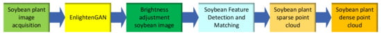 During the operation of farmland, the complex production environment of a soybean field, the diversity of soybean plants, and how to obtain accurate information on those soybean plants have caused troubles for the operation of agricultural machinery and equipment. Agricultural machinery and equipment can easily cause irreparable damage to soybean plants during the collection of soybean growth information. In addition, the complex and changeable field environment and the diversity of soybean plants make it impossible for agricultural machinery and equipment to monitor the growth status of soybean crops in real time, which increases the difficulty of collecting information on soybean plants. By applying three-dimensional reconstruction technology to the perception process of agricultural machinery and equipment on soybean plants, a three-dimensional model close to the actual soybean plants was constructed to generate fine soybean plant phenotypes, to achieve non-contact collection of more comprehensive and specific accurate information of soybean plants, to quickly and efficiently evaluate the growth status of soybean plants, and to provide accurate information for agricultural machinery and equipment to carry out field soybean plant operations. In the reconstruction of a soybean plant model under low illumination, as shown in Figure 1, through the EnlightenGAN image enhancement network for the collected multi-view samples of soybean plants under low illumination, the brightness-enhanced soybean plant image is obtained by illumination adjustment. The SIFT (scale-invariant feature transform) [] algorithm is used for image feature detection. The feature points are different from other ordinary pixels on the image. It contains more key information needed for three-dimensional reconstruction. The quality of feature point detection directly determines the accuracy of the three-dimensional reconstruction model. The effective and low error rate feature points are used to match the feature points of images from different perspectives. According to the paired matching feature points, the SFM algorithm is used to determine the three-dimensional structure of soybean plants, and the sparse point cloud of soybean plants [] is generated. The dense three-dimensional point cloud of soybean plants is restored by the patch-based PMVS algorithm, and a three-dimensional model close to the actual soybean plants is reconstructed.