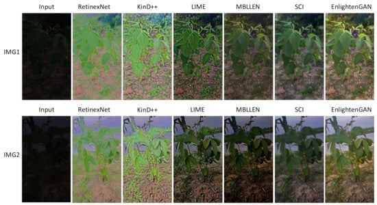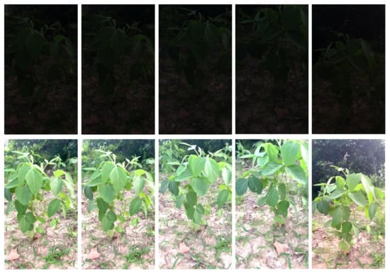 The enhanced soybean plant images are evaluated using multi-view soybean plant images collected at low illumination. Experiments compare different classical image enhancement networks for a test set of soybean plants and test the image enhancement effect of different image enhancement networks on soybean plants at low illumination. As shown in Figure 7, soybean plant images enhanced by the RetinexNet algorithm suffer from overexposure, color distortion, and local area blurring. The overexposure of the KinD++ algorithm [] is mitigated, but the colors are not realistic. The sharpness of the leaves of the soybean plants is high and contains visible noise. The LIME algorithm alleviates the overexposure and color distortion to some extent, but the brightness is not improved enough and there is texture distortion. The MBLLEN algorithm has better color restoration, but the local area of the soybean plant is dark and deviates from a natural light image. The color and noise of the soybean plant images are well processed by the SCI algorithm [], but the brightness is dimmer after enhancement. The EnlightenGAN algorithm enhances the soybean image with a light brightness closer to the natural light brightness to recover better and more natural color for soybean details. As shown in Table 1, different algorithms are used to enhance the contrast of the soybean plants. The high SSIM of the EnlightenGAN algorithm indicates that the structure and texture details of soybean plants are well recovered at low illumination. Although its PSNR is lower than that of the KinD++ algorithm, the enhanced illumination brightness of the KinD++ algorithm is more prominent, but the actual illumination enhancement is improved by the EnlightenGAN algorithm.