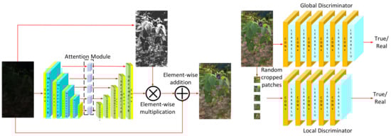 The EnlightenGAN image enhancement network uses an attention-guided U-Net as a generator to guide soybean plant information through a global and local dual discriminator, using self-feature retention losses to guide the training process, as shown in Figure 3. The generator network is composed of a feature extraction module, an information reconstruction module, and a brightness adaptive module. The feature extraction module mainly extracts image feature information. The information reconstruction module recovers the image information from the extracted image feature map through deconvolution operation. The brightness adaptive module adjusts the illumination brightness freely, so that the enhanced image will not have overexposure or underexposure. In order to improve the global illumination while adaptively enhancing the local area illumination, the global-local structure dual discriminator uses PatchGAN [] to identify the normal-illumination image and the enhanced image. The judgment information of the two discriminators will be fed back to the generator to continuously adjust the image enhancement effect, so that the enhanced image and the normal-illumination image cannot be distinguished by the two discriminators, thus completing the adaptive enhancement of the image. The local discriminator randomly cuts five local blocks from the enhanced soybean plant image and the normal-illumination soybean plant image and learns to distinguish them from the normal-illumination image or the enhanced image. The global-local structure can make the local blocks of the enhanced image close to the normal-illumination image, which is the key to avoiding local overexposure or underexposure. The global discriminator uses the relativistic discriminator structure to estimate the probability that the normal-illumination soybean plant image is more realistic than the enhanced soybean plant image, so that the generator synthesizes the enhanced soybean plant image more realistic than the normal-illumination soybean plant image. The generator normalizes the illumination channel of the input RGB image, uses the difference between the elements to generate the self-regularized attention map, adjusts the size of the attention map to extract the multi-level features of different depth layers, retains the rich texture information of the image, and uses the multi-scale context information to synthesize high-quality enhanced images, combined with the discriminator feedback identification information. So that the output image dark area will not be overexposed or underexposed, it effectively removes the noise hidden in the dark area, color distortion and other degradation problems, and adjusts the appropriate lighting conditions to maintain the texture and structure of soybean plants.