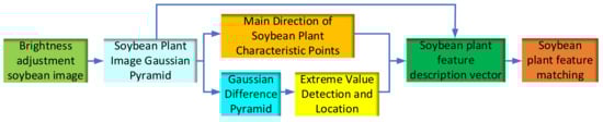 The extreme point detection of the soybean plant scale space is performed by comparing the value of 26 adjacent points between the adjacent two layers of images in the same group of the points to be detected in the Gaussian difference pyramid; to ensure that the value of the detection point is the maximum or minimum value of its adjacent points, the detection point is determined to be a key point of the image at this scale, and the feature information coordinates and scale of the point are recorded. Through histogram statistics, the gradient amplitude and direction corresponding to the pixels in the neighborhood of the key points of soybean plants are calculated. The cumulative peak of the gradient amplitude is the main direction of the key points, and the corresponding feature point descriptors are generated to make them not change with various changes, to improve the probability of the correct matching of feature points. After screening and normalization, the final soybean plant feature description vector is obtained, in which the gradient amplitude and direction calculation Formulas (4) and (5) are: