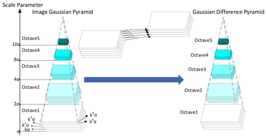 Gaussian difference pyramid is the premise of detecting the extreme points of soybean plant image in the later stage. As shown in Figure 5, the Gaussian difference pyramid of the soybean plant image is obtained by subtracting the adjacent layers in each group of image sequences in the Gaussian pyramid composed of multiple groups of soybean plant image sequences. Each group of soybean plant image sequences in the Gaussian pyramid is calculated by convolution of the basic image in the group and the Gaussian function that changes the scale factor multiple times. The adjacent layers in the same group of image sequences are subtracted to form the Gaussian difference pyramid convolution , thus constructing a multi-scale space where and is the scale factor of different layers. denotes a Gaussian function with a scaling factor. Formulas (1)–(3) are: