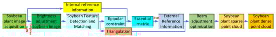 As a new direction of current agricultural development, intelligent agriculture [,,,] not only changes the industrial model that must rely on environmental planting in traditional agriculture, but also improves the quality of agricultural products, efficiently uses various agricultural resources, achieves considerable economic and social benefits, and realizes agricultural refinement, high efficiency, and greening. Crop phenotype [,,] is a key link in the analysis of crop growth environment, which is used to comprehensively evaluate the growth morphology and traits of crops in complex and changeable farmland environments. It is an effective way to improve the field operation of agricultural machinery and equipment. Traditional soybean plant phenotypic [] measurement and analysis, and the manual collection of soybean plant information on the farmland are time-consuming and labor-intensive. The complex and changeable field environment and the diverse characteristics of soybean plants [] make it difficult to obtain soybean plant phenotypic information, which increases the difficulty of accurate identification of soybean plants [,]. In recent years, three-dimensional reconstruction technology [] has played an increasingly important role in the study of soybean plant phenotype. Applying three-dimensional reconstruction to the field operation of agricultural machinery and equipment, a model closer to the actual soybean plant phenotype is constructed, and the growth morphology and traits of soybean plants are evaluated quickly and efficiently. It provides accurate information for agricultural machinery and equipment to accurately identify soybean plants, effectively solves the problems of the complex production environment in soybean fields and the diverse characteristics of soybean plants and accurate soybean plant information, and meets the important needs of refinement and high efficiency of intelligent agriculture.